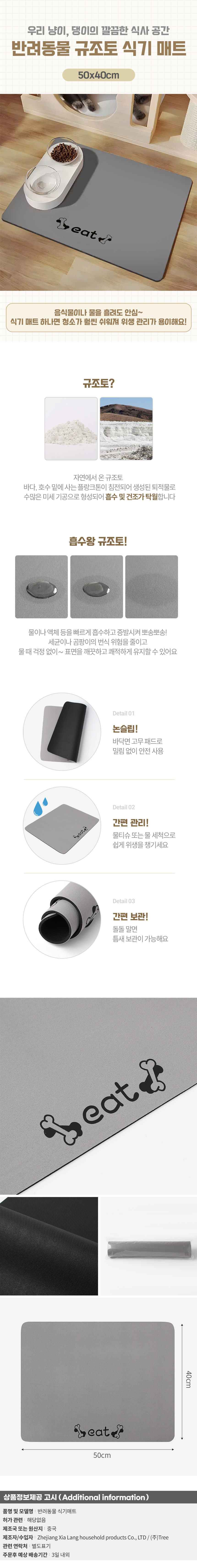 우리 냥이, 댕이의 깔끔한 식사 공간 반려동물 규조토 식기 매트 음식물이나 물을 흘려도 안심~ 식기 매트 하나면, 청소가 훨씬 쉬워져 위생 관리가 용이해요! ? 흡수왕 규조토! 물이나 액체 등을 빠르게 흡수하고 증발시켜 뽀송뽀송! 세균이나 곰팡이의 번식 위험을 줄이고 물 때 걱정 없이~ 표면을 깨끗하고 쾌적하게 유지할 수 있어요. ** 자연에서 온 규조토 바다, 호수 밑에 사는 플랑크톤이 침전되어 생성된 퇴적물로 수많은 미세 기공으로 형성되어 흡수 및 건조가 탁월합니다. ? 논슬립! 바닥면 고무 패드로 밀림 없이 안전 사용 ? 간편 관리! 물티슈 또는 물 세척으로 쉽게 위생을 챙기세요 ? 간편 보관! 돌돌 말면 틈새 보관이 가능해요 |