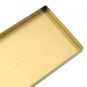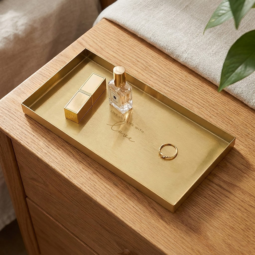 럭셔리한 골드 소품트레이 두께감 있는 스틸 + 모던한 골드 컬러 액세서리, 화장품, 인테리어 소품, 촬영소품 등 무엇이든 멋스럽게 담아내는 트레이입니다. 테두리 가드가 작은 소품도 흘러내리지 않도록 잡아줘 깔끔하고 안전하게 보관할 수 있습니다. |