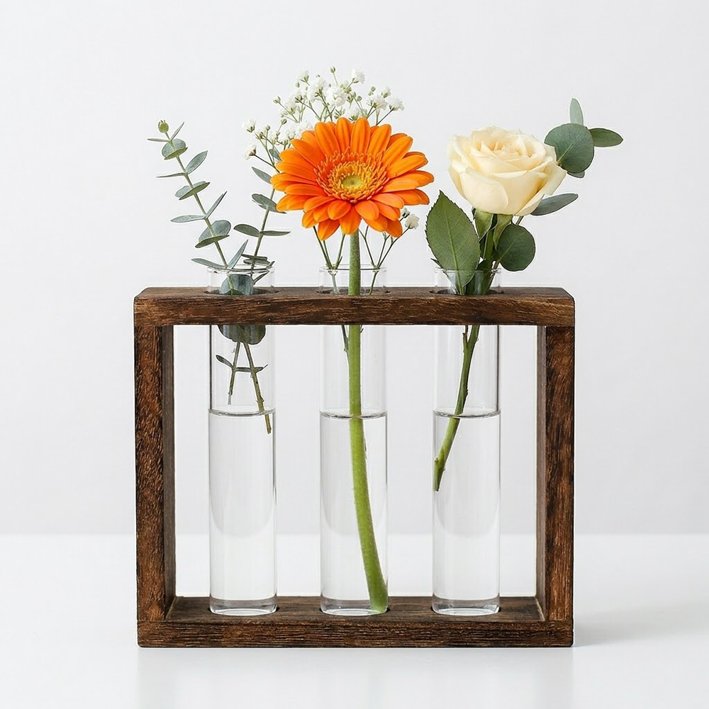 공간에 숨을 불어넣는 감성 시험관 꽃병 작은 꽃 몇 송이와 여백으로 공간에 잔잔한 분위기를 더합니다. 많이 채우지 않아도 충분히 아름다운 시험관 꽃병의 매력 ▶ 취향에 따라 피어나는 공간, 다채로운 플랜테리어 - 사계절의 생동감, 생화 - 변치 않는 묻, 드라이플라워 - 뿌리까지 감상하는 수경재배 ▶ 투명한 유리와 따뜻한 오동나무의 조화 차가운 유리의 맑은 느낌과 내추럴한 오동나무 프레임이 어우러져 공간에 정적이면서 편안한 분위기를 더합니다. 식탁 위에 가볍게, 창가에 조용한 포인트로, 선반 위 작은 여백을 채우는 오브제로. |