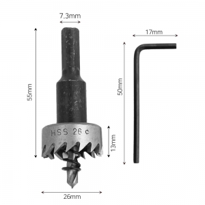 철판류 천공! 빠른 드릴링! 철공용 HSS 홀커터 홀쏘(직경 26mm) 특징 - HSS(High Speed Steel) 하이스강 소재 - 135도 드릴링 팁설계! 정확한 위치 및 고속 타공 가능 - 강력한 회전에도 견뎌내는 뛰어난 내마모성 - 우수한 절삭력으로 정확한 홀컷팅 - 스프링 장착으로 순간밀림방지 용도 함석판, 아연판, 주철판, 알루미늄판, 스테인리스 스틸 등 적용 가능 기기 핸드드릴/ 충전드릴/ 드릴링머신 * 7.3mm 육각 생크로 전기드릴 및 드릴머신에 호환됩니다. 사용방법 1. 뚫고자 하는 철판에 수직으로 위치합니다. 2. 구멍뚫을 곳의 중심을 드릴로 타공합니다. 중심이 뚫렸으면 수직을 유지하며 천천히 속도를 높여가며 구멍을 만들어갑니다. 3. 구멍 사이즈가 클수록 드릴 회전속도를 줄여 저속으로 진행하기 바랍니다. 4. 구멍뚫기 작업 완료 * 제품 구성: 홀쏘, 육각렌치 |