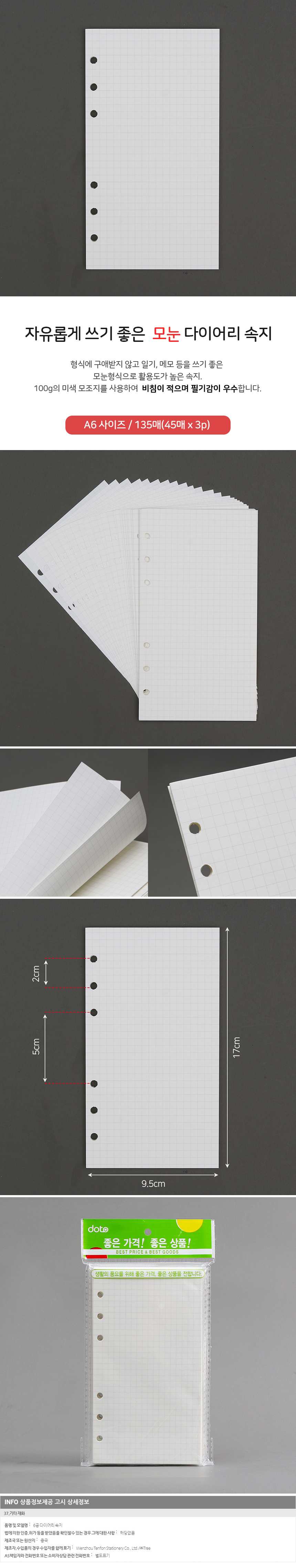 자유롭게 쓰기 좋은 모눈 다이어리 속지 형식에 구애받지 않고 다이어리를 꾸미기 좋은 모눈 형식으로 활용도가 높은 속지. 100g의 미색 모조지를 사용하여 비침이 적으며 필기감이 우수합니다. - A6 사이즈 / 135매(45매 x 3p) |