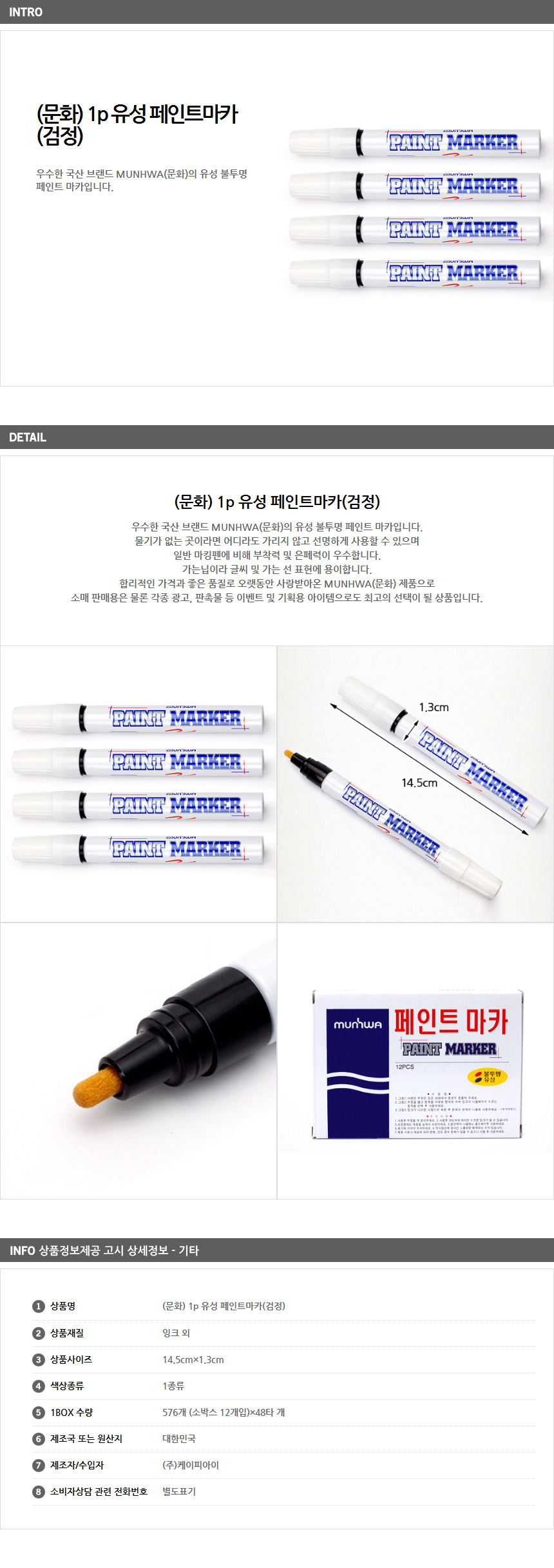 우수한 국산 브랜드 MUNHWA(문화) 유성 불투명 페인트 마카 물기가 없는 곳이라면 선명하게 사용할 수 있으며 일반 마킹펜에 비해 부착력 및 은폐력이 우수합니다. 합리적인 가격과 좋은 품질로 오래동안 사랑받아온 문화제품으로 소매 판매용은 물론 각종 광고, 판촉물 등 이벤트 및 기획용 아이템으로도 최고의 선택이 될 상품입니다. |