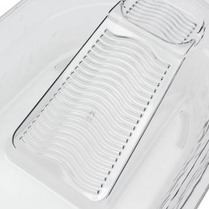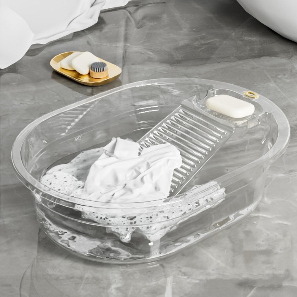 빨래판 대야 * 기능 - 빨래를 문질러 빨 수 있는 빨래판 - 옷을 담글 수 있는 깊이감 있는 대야 - 동선이 편리한 비누받침 비누 물러짐 방지, 돌기 구조 + 사이드 물빠짐 디자인 - 논슬립 바닥 발 (논슬립패드 장착 후 사용) - 걸어서 보관 |